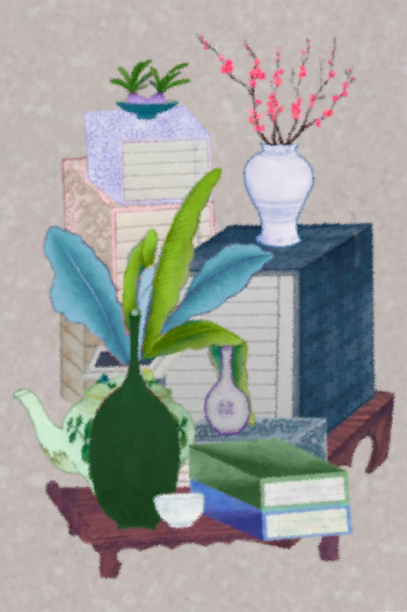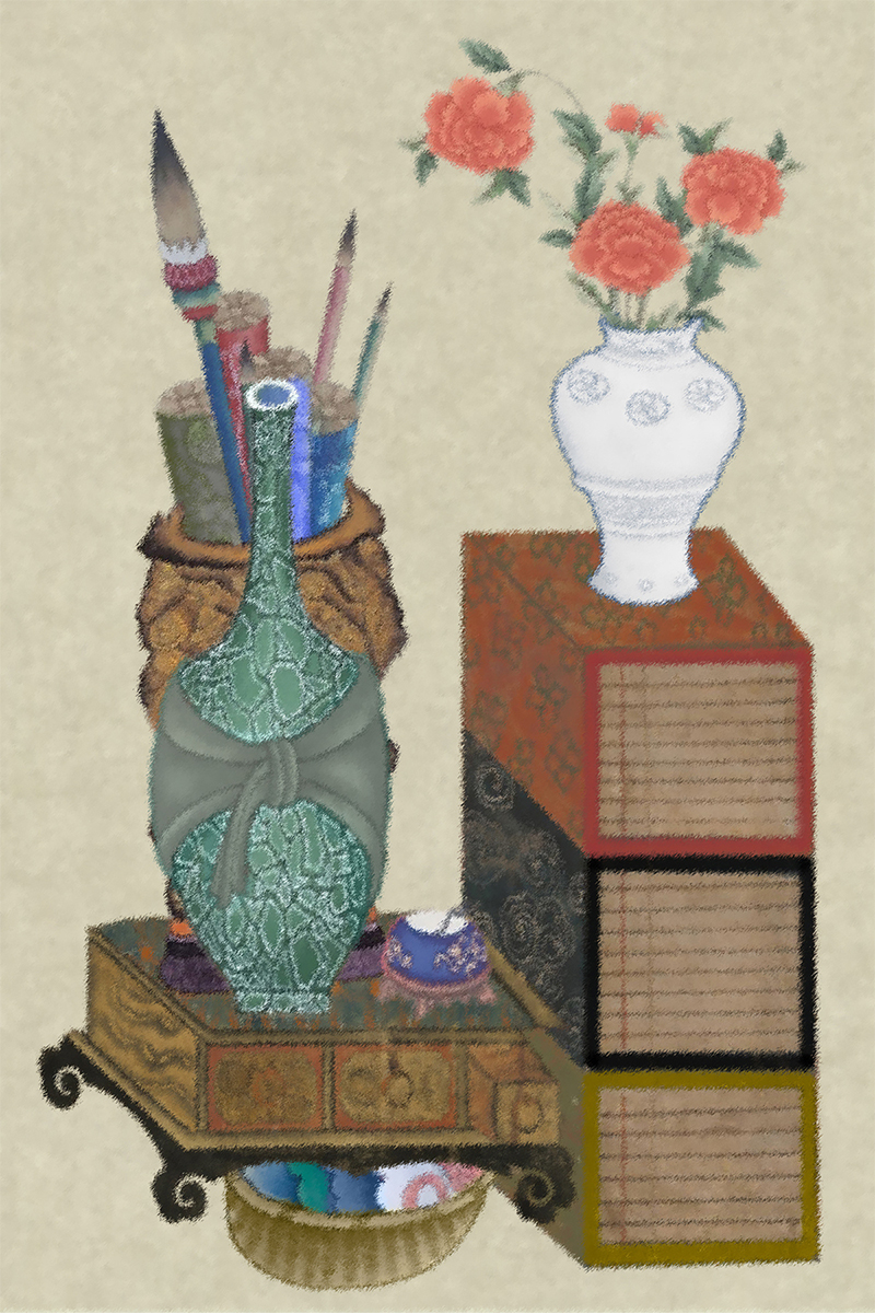 책가도(冊架圖)의 책장은 여러 칸으로 나뉘어져 각각 독립적인 공간으로 볼 수 있다. 이 작은 공간은 책뿐만 아니라 다양한 사물로 채워지며, 각자의 의미를 품는다. 혹자는 민화 책가도가 개인의 정서에 집중하는 서양 회화와 달리 우리 그림은 철저히 내용과 형식을 중시하며 공동체의 가치와 미감을 담아낸다고 말한다.
